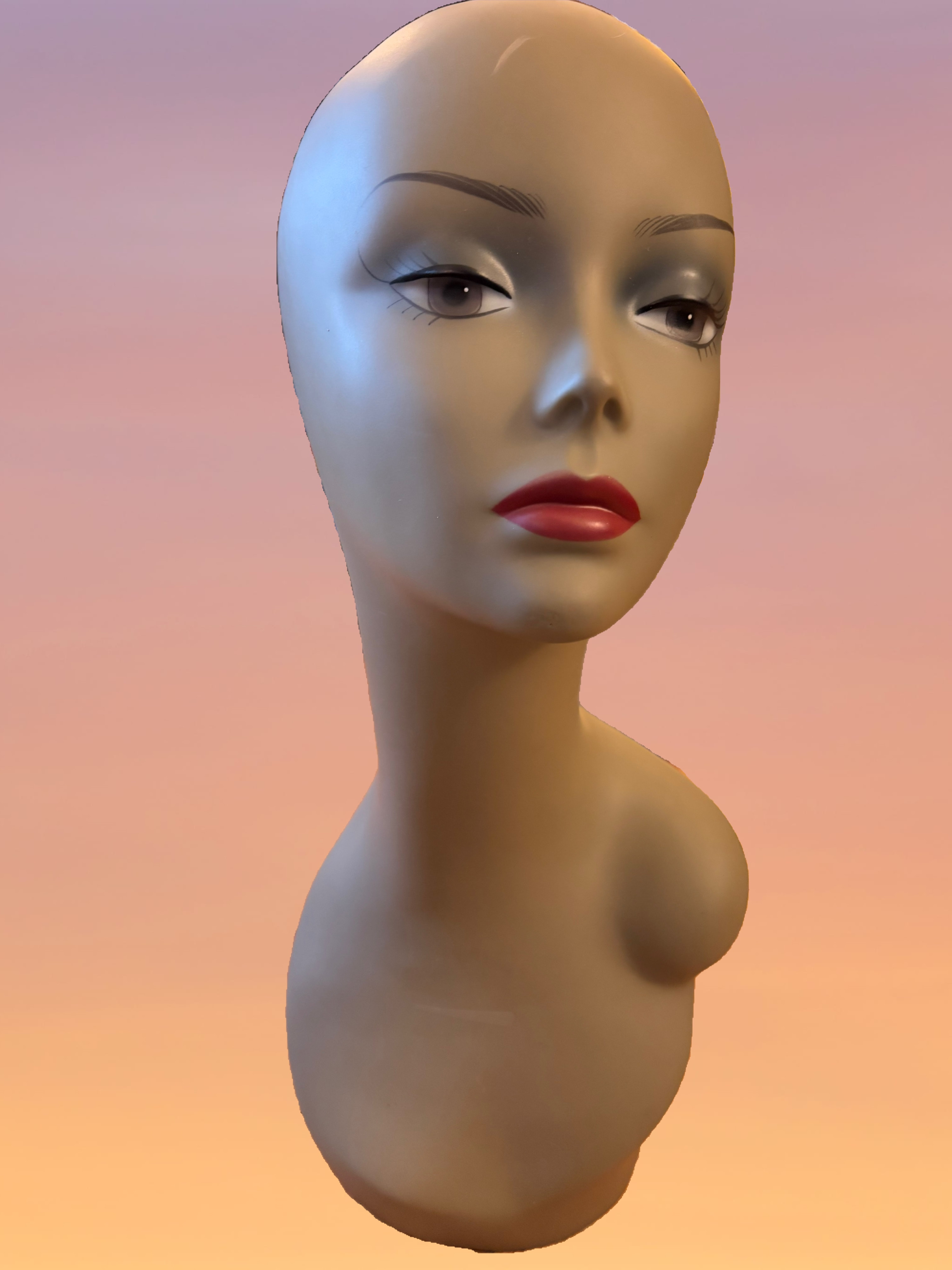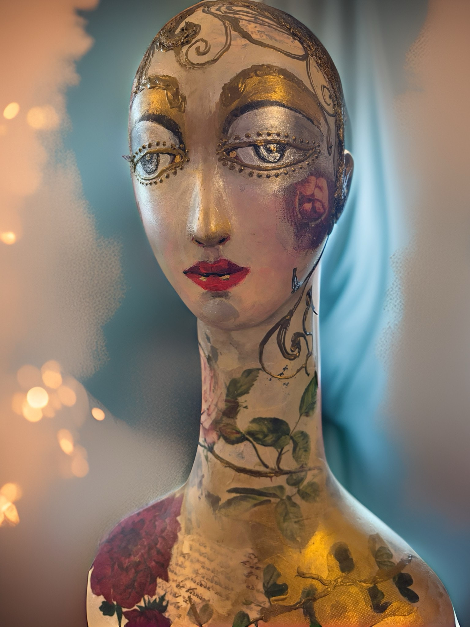One of a kind media sculpture bust featuring hand painted detail and gold embellishments using an existing display head. It will add warmth, beauty and a touch of elegance to any space. Perfect as a statement artwork, hat stand, or jewelry display.